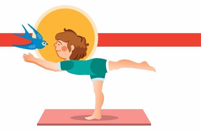 Суть: малыш стоит прямо, ноги на ширине плеч, руки опущены. На вдохе поднять руки вверх, одну ногу отвести назад. Спина — параллельно полу. Через 3 с согнуть и подтянуть к груди ногу. Повторить по 5 раз для каждой ножки.