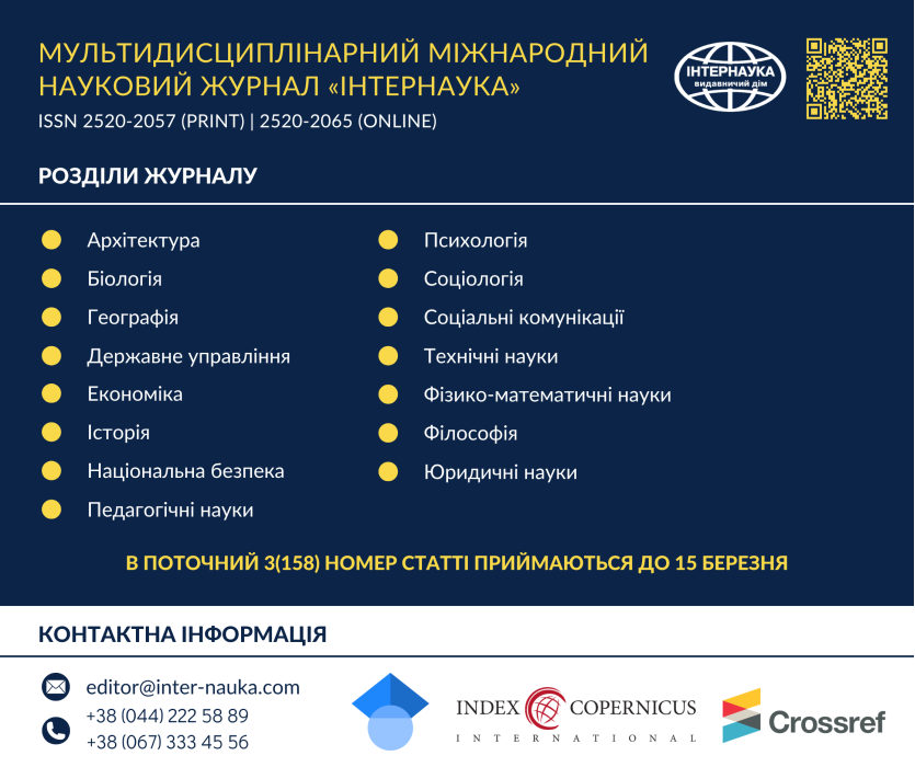 Триває набір наукових статей до Мультидисциплінарного міжнародного наукового журналу «Інтернаука». Журнал виходить двічі на місяць. Міжнародним центром періодичних видань (ISSN International Centre, Париж) видання зараховано до міжнародного реєстру періодичних засобів масової інформації з числовим кодом ідентифікації: ISSN 2520-2057 (Print); ISSN 2520-2065 (Online).